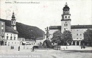 - SALZBURG (SALISBURGO, AUSTRIA). VEDUTA DELLA FONTANA E DEL CAMPANILE NELLA PIAZZA DELLA CITTÀ