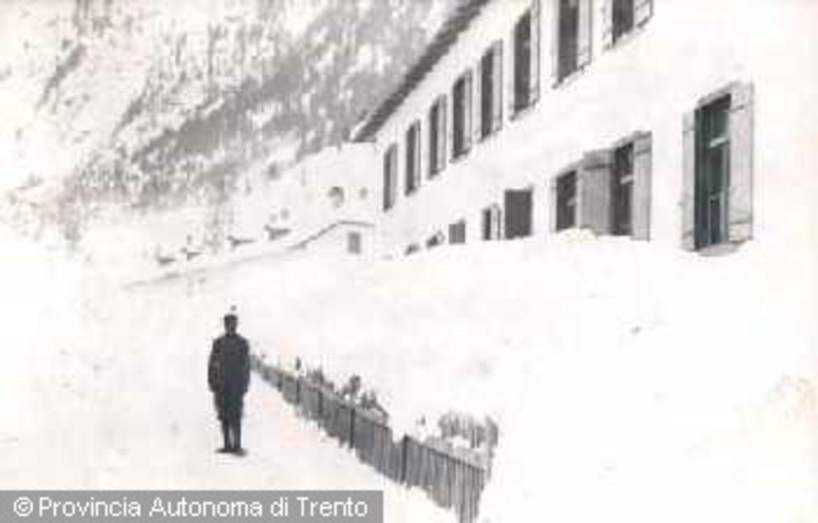 - VAL DI STAV+L, STAV+L (TN). VEDUTA DELLE CASERME AUSTRIACHE, IN PRIMO PIANO UOMO IN DIVISA. 1915-1918