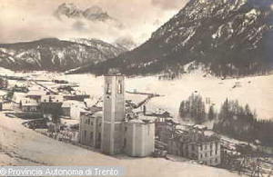 VEDUTA DI UN PAESE SITUATO IN UNA VALLE, IN PRIMO PIANO CHIESA DANNEGGIATA DAI BOMBARDAMENTI