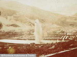 VALLE INNEVATA CON CORSO D'ACQUA RIPRESA DA UNA TRINCEA, AL CENTRO ZAMPILLI D'ACQUA CAUSATI DA UN BOMARDAMENTO
