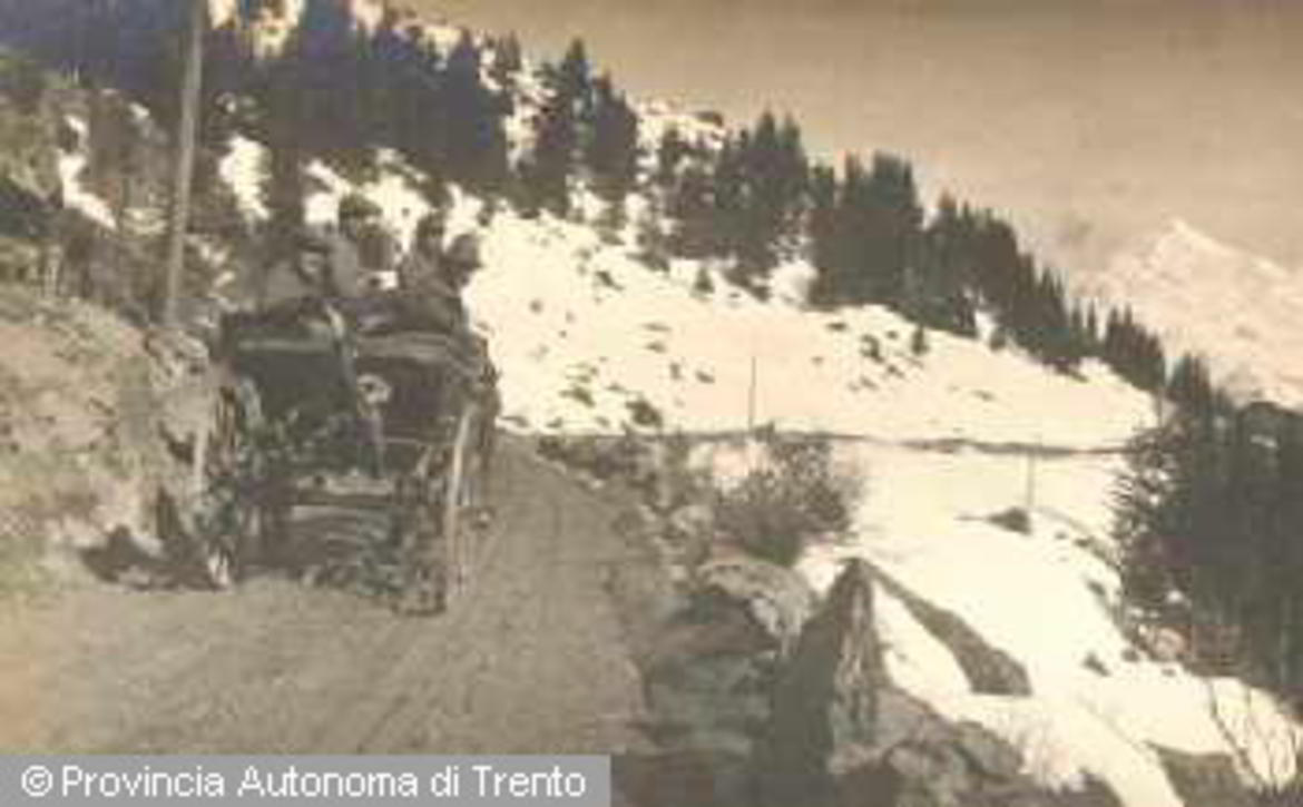 - ALTA VALTELLINA, VAL FURVA (SO). VEDUTA DELLA VALLE, IN PRIMO PIANO MILITARI IN CARROZZA LUNGO UNA STRADA STERRATA, SULLO SFONDO IL PIZZO TRESERO. MAG. 1916