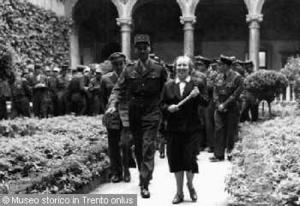 - TRENTO, CASTELLO DEL BUONCONSIGLIO. UFFICIALI FRANCESI NEL CORTILE DEI LEONI IN OCCASIONE DELLA VISITA AL MUSEO, IN PRIMO PIANO BICE RIZZI. 15 MAG. 1952