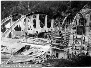 - Val di Genova / Costruzione dell'impianto idroelettrico di S. Massenza / Cantiere per la costruzione del ponte-canale Campiglio sul corso di un torrente di montagna