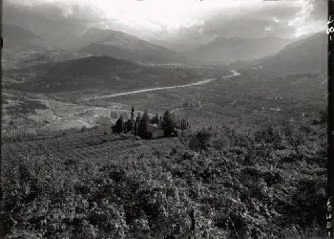 Vallagarina, veduta della valle e della Chiesa di S. Antonio, da Pomarolo