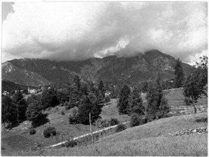 Veduta paesaggistica; piccolo centro abitato immerso nei boschi