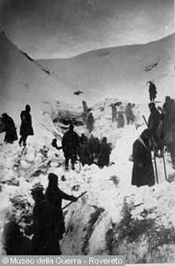 ZERSTÖRTE UNTERKÜNFTE AUF MARMOLATA DURCH LAVINE [SULLA MARMOLADA, ACCANTONAMENTI DISTRUTTI DA UNA VALANGA]