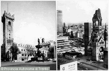 Accostamento di due immagini raffiguranti la piazza Duomo di Trento e i ruderi della...