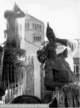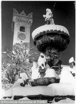 F.lli Pedrotti (1929 - 1979)Trento / Piazza Duomo / Fontana del Nettuno ricoperta di neve sullo sfondo della Torre Civica