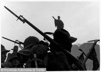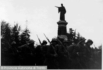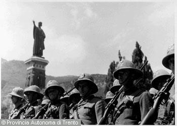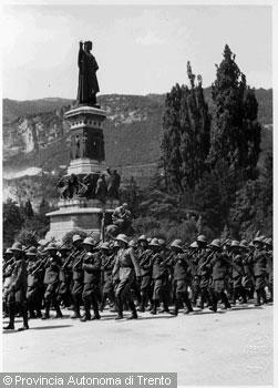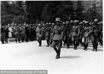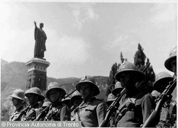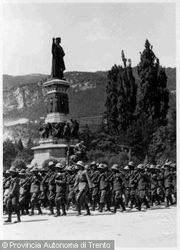 F.lli Pedrotti (1929 - 1979)Trento, piazza Dante / Soldati in parata durante un raduno militare marciano sotto il monumento...