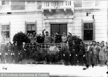 Perdomi Sergio (1887 - 1935)Trento, piazza Dante, Banca d'Italia, autorità in attesa del passaggio del gerarca Giuriati (1931)
