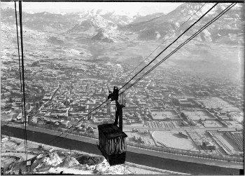 Trento, Sardagna, veduta panoramica invernale sulla città con transito della cabina della funivia