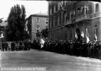 Unterveger Enrico (1876 - 1959)TRENTO, PIAZZA DANTE. CERIMONIA PER LA CONSEGNA DI MEDAGLIE E CROCI DI GUERRA ALLE MADRI DEI...