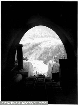 Uscita esterna di una galleria; in primo piano le rotaie per il trasporto del materiale di scavo