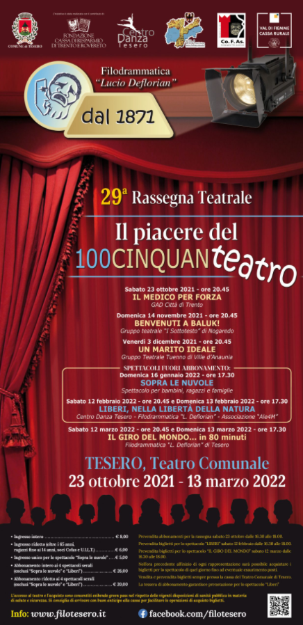 La tradizionale rassegna di teatro amatoriale, giunta alla 29a edizione, è dedicata per l’occasione al prestigioso traguardo raggiunto il 12 luglio 2021 dalla nostra associazione che porge un caloroso invito a tornare al Comunale di Tesero per quello che si preannuncia come un piccolo festival  dal significativo titolo “Il piacere del 100CinquanTeatro”.