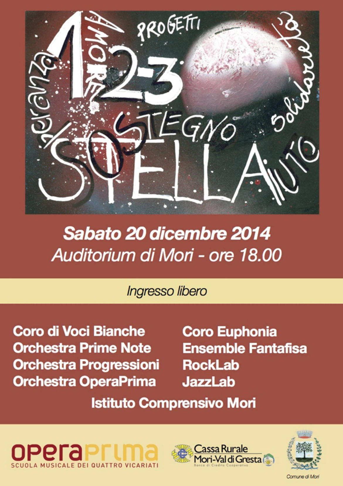 Concerto in favore dell'Associazione 1-2-3 Stella, il cui obiettivo è il sostegno all'infanzia. Intervengono i gruppi di musica moderna, l'ensemble Fantafisa, le orchestre Prime Note di Mori e Brentonico, Progressioni, Opera Prima e il Coro di Voci Bianche della Scuola Musicale dei Quattro Vicariati e il Coro Euphonia.