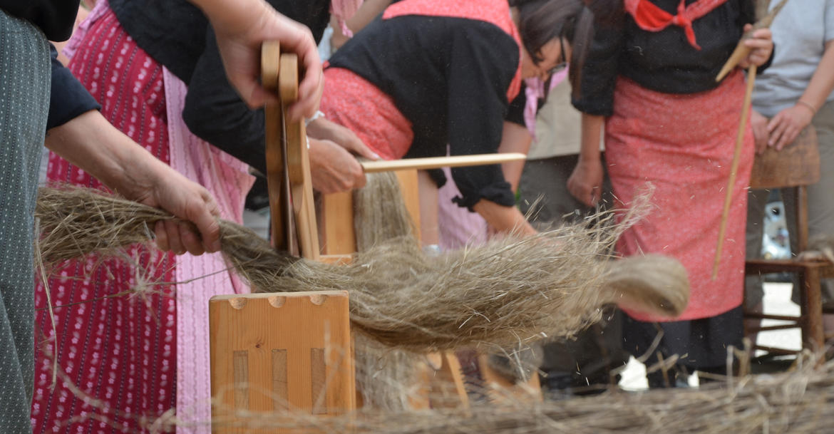 Im Mittelpunkt der Veranstaltung sind die Frauen des Ökomuseums, welche qualifizierte Weberinnen geworden sind. Die örtlichen Textilfasern sind Wolle und Leinen. Aber ist Leinen spinnen wirklich so einfach?