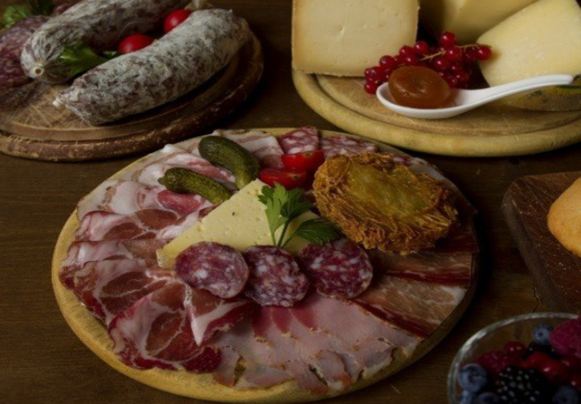 Aperitif-Abendessen mit Käsespezialitäten aus dem Val di Fiemme, Speck und Wurst aus dem Betrieb "Maso dello Speck", Bergkräuter des Biobetriebes Elio Barbugli und weitere Produkte aus der Region, begleitet von Weinen aus Trentino