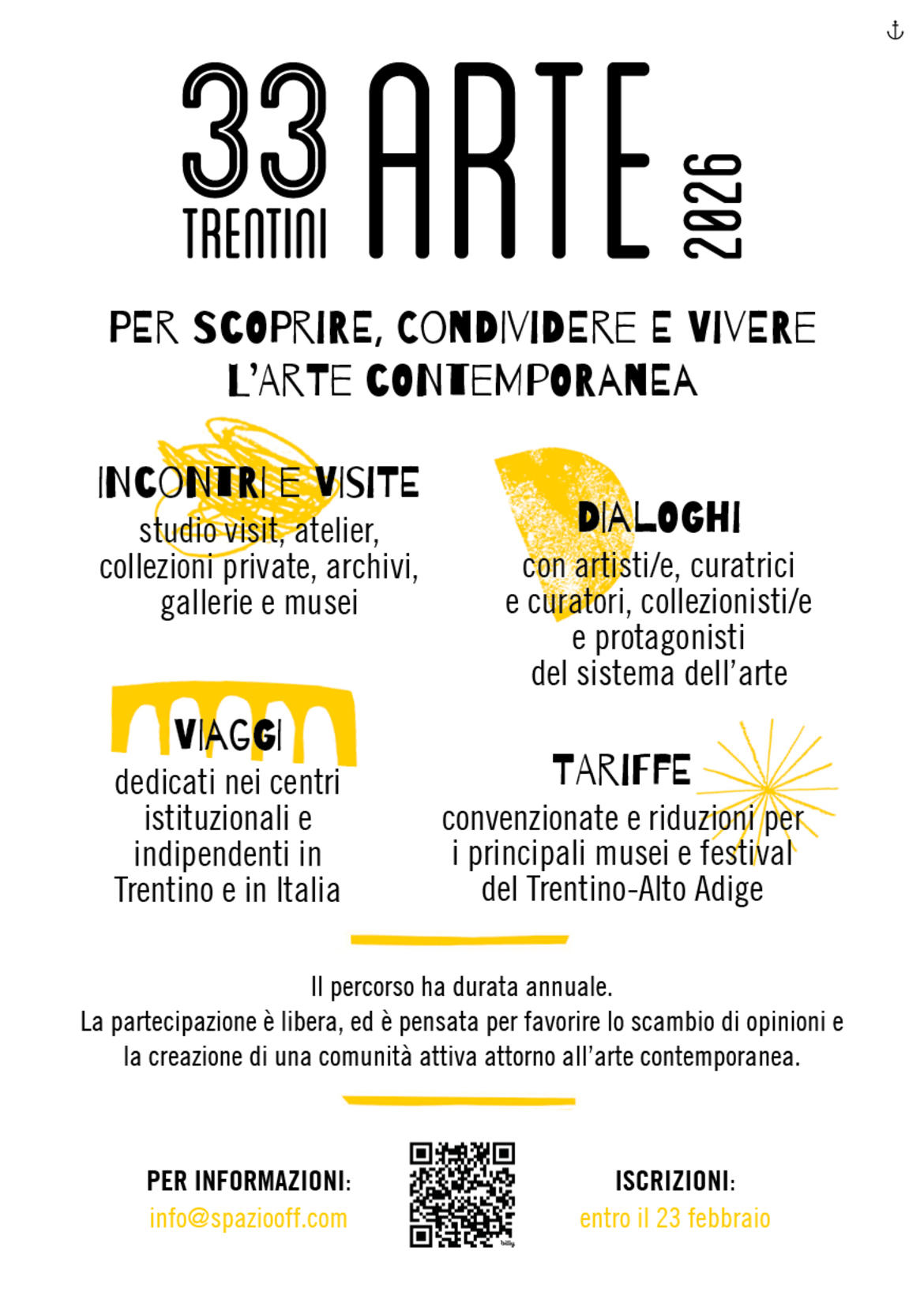 Per iscriversi (entro lunedì 23 febbraio): bit.ly/33-trentini-arte Per tutte le info: spaziooff.com | info@spaziooff.com | +39 333 27 53 033 | +39 329 711 79 91