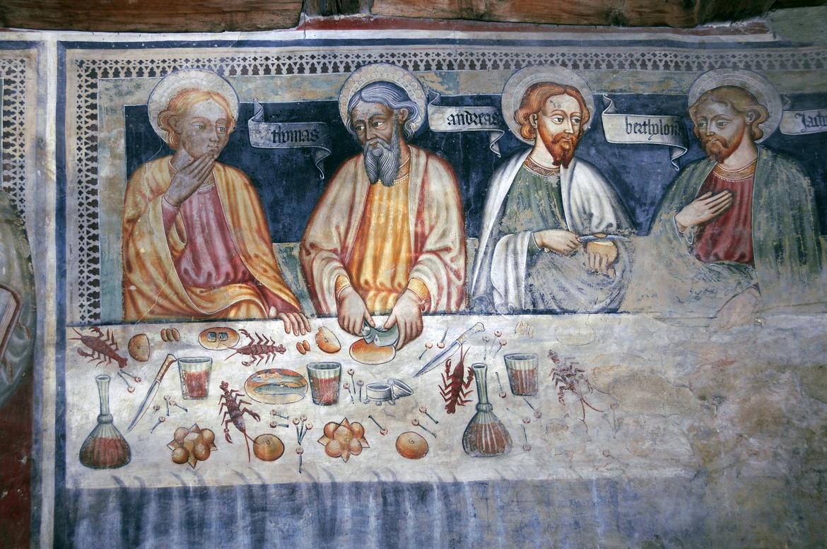 Rossi sono anche i gamberi che, sorprendentemente, riempiono le tavole di numerose Ultime Cene dipinte, soprattutto fra Quattro e Cinquecento, in Veneto e Friuli, ma anche lungo tutta la dorsale alpina e prealpina, dalla Savoia al Canton Ticino, fino alle valli bergamasche. Gamberi di fiume che rappresentano, è evidente, un apprezzato alimento delle comunità locali. Ma che hanno, senza dubbio, anche una qualche valenza simbolica, ormai, per noi oggi, di non immediata lettura. Tanto che le interpretazioni degli studiosi variano da presunti riferimenti antisemiti o ereticali (per via di quell’andatura a ritroso tipica di questi crostacei, come di chi, insomma, si ritrae dalla verità, che è Cristo) alla denuncia, in quelle rosse corazze, del diabolico tradimento che si è insinuato con Giuda anche fra i Dodici...