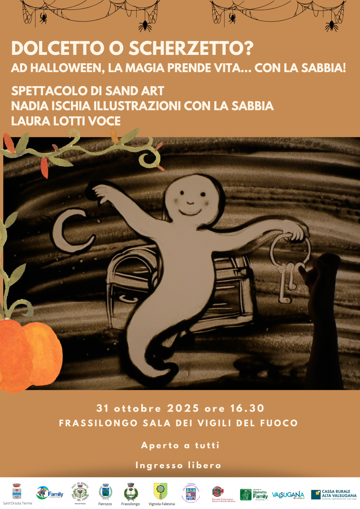 Nuovo appuntamento nell’ambito del progetto Cultura in rete venerdì 31 ottobre alle ore 16.30 presso la sala della Caserma dei Vigili del Fuoco a Frassilongo con lo spettacolo di Sand Art Dolcetto o scherzetto? a cura di Nadia Ischia - Sand artist e Laura Lotti lettrice.