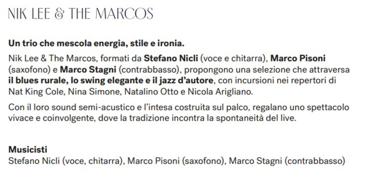 Inoltre, è possibile usufruire di uno sconto del 10% per una cena al ristorante Ai Vicoli, prima o dopo lo spettacolo. È sufficiente presentare il biglietto del concerto.