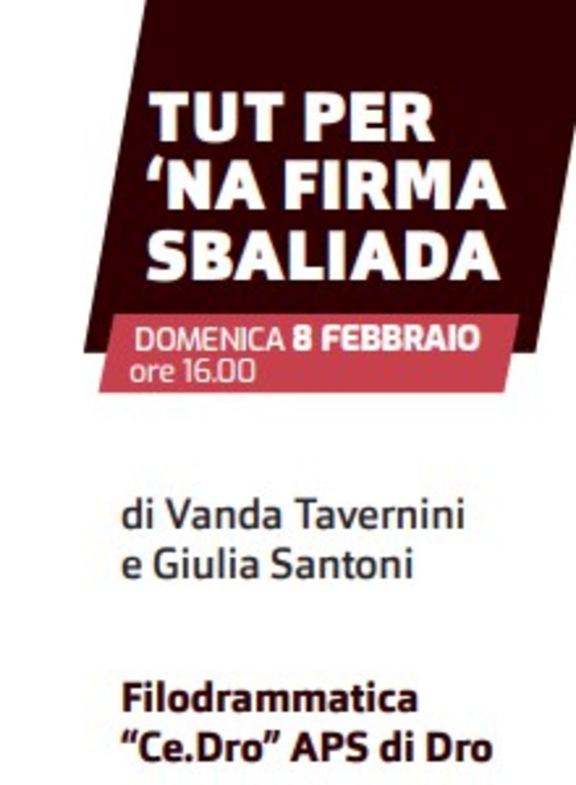 Filodrammatica “Ce.Dro” di Dro con «TUT PER ‘NA FIRMA SBALIADA», un testo brillante di Vanda Tavernini e Giulia Santoni. Il sipario si alzerà alle ore 16,00.