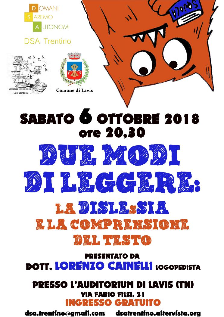 All'interno della Settimana europea della dislessia e dei disturbi specifici dell'apprendimento che si tiene in Italia dall'1 al 7 ottobre, DSA Trentino propone questo incontro condotto dal dott. Lorenzo Cainelli, logopedista.
