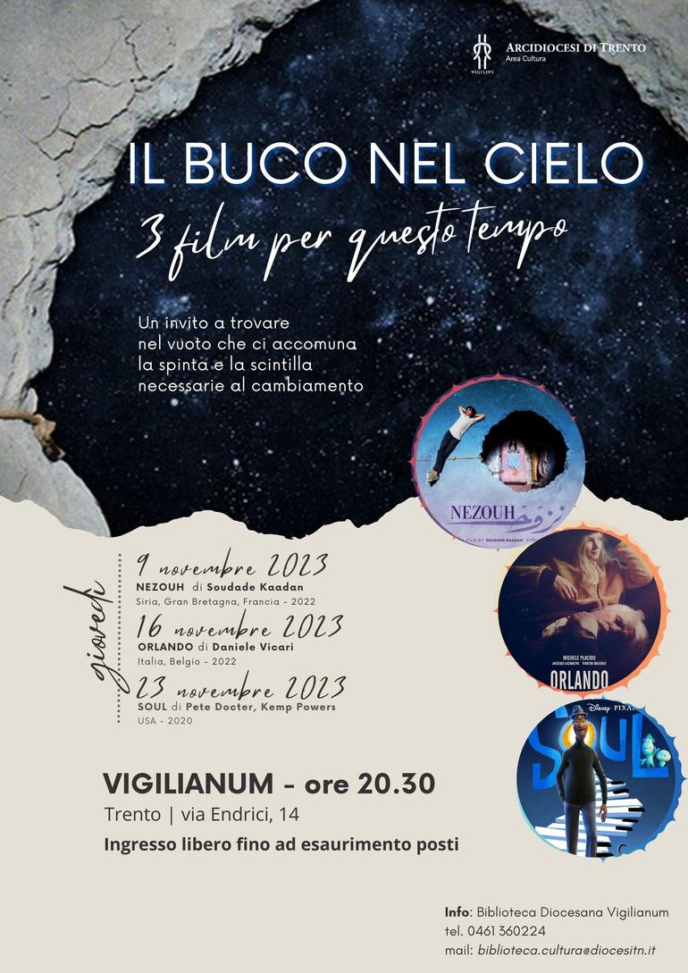 Giunge alla sua conclusione la rassegna di cineforum organizzata dalla Biblioteca Diocesana Vigilianum, per stimolare la riflessione in preparazione al Natale.” Il buco nel cielo” è il titolo della rassegna, pensata per questo tempo che non è più chiamato all’attesa ma al cambiamento. Un invito a trovare nel vuoto che ci accomuna la spinta e la scintilla necessarie.