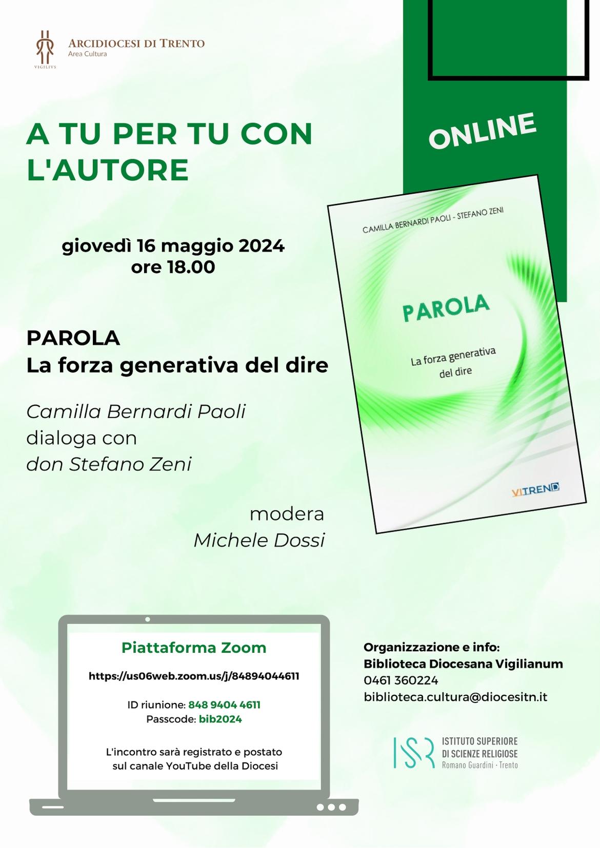 Camilla Bernardi Paoli, laureata in Scienze Filosofiche, e don Stefano Zeni, biblista e direttore dell’ISSR, presenteranno il volume La parola. La forza generativa del dire (Collana Echi teologici, editrice ViTrenD di Trento). Michele Dossi, docente di Filosofia presso l’ISSR, modererà la conversazione.