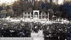 TRENTO, PIAZZA DANTE. FOLLA ASSISTE ALLA FUNZIONE RELIGIOSA IN OCCASIONE DEL 1. CONGRESSO EUCARISTICO DIOCESANO. 9 MAG. 1926