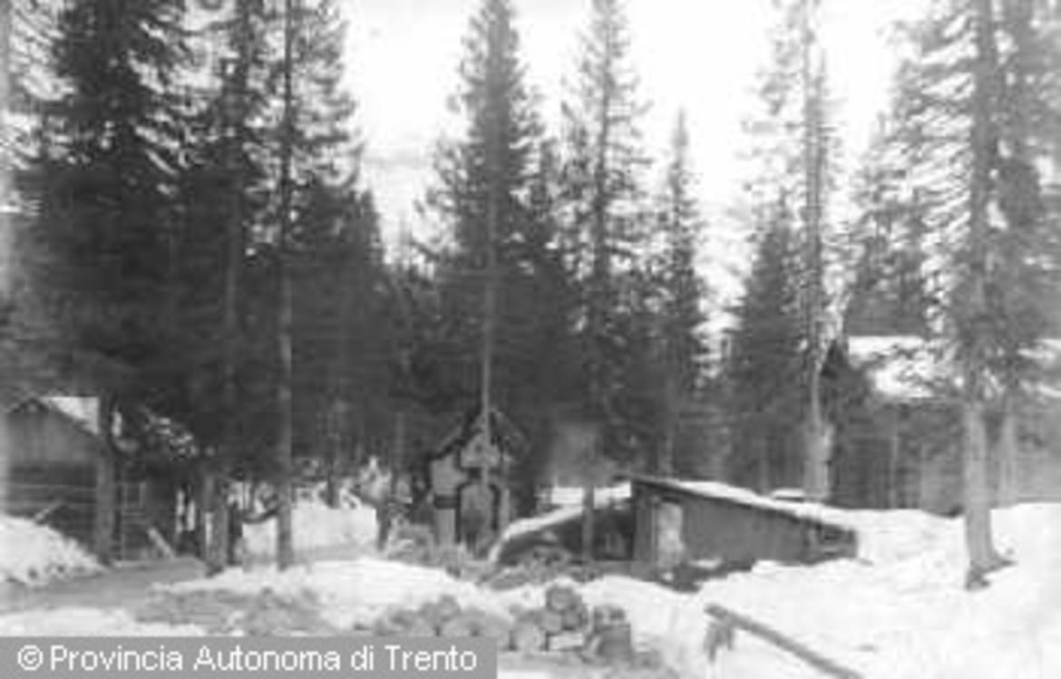 VAL DI SOLE, PASSO DEL TONALE (TN). VEDUTA DELL'ACCAMPAMENTO MILITARE AUTRIACO CON CINEMATOGRAFO DI CAMPO. 1915-1918