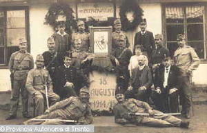 KATZENAU, LIENZ (AUSTRIA). AUTORITÀ CIVILI E MILITARI ATTORNO ALLA FOTO DELL'IMPERATORE IN OCCASIONE DEL SUO COMPLEANNO, SI RICONOSCE IL RESPONSABILE DEL CAMPO DI INTERNAMENTO JOSEPH REICHER. 18 AGO. 1915