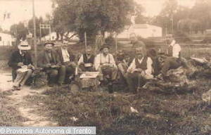 - KATZENAU, LIENZ (AUSTRIA). GRUPPO DI INTERNATI DI MALÈ DURANTE IL PASTO ALL'APERTO. 1915-1918