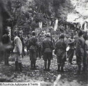 - TRENTO. CASTELLO DEL BUONCONSIGLIO. FOSSA DELLA CERVARA. CESARE BATTISTI DURANTE LA LETTURA DELLA SENTENZA DI CONDANNA A MORTE PRIMA DELL'ESECUZIONE. 1916 LUG. 12