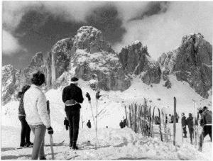 Dolomiti / Col Rodella / Sciatori presso il rifugio sullo sfondo del Sassolungo