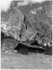 Dolomiti / Pale di S. Martino / Due baite sullo sfondo della Pala di San Martino e dei Campanili del
