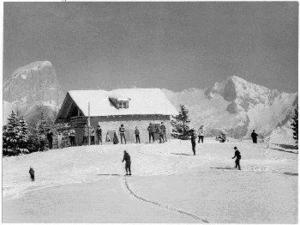 Dolomiti / Sciatori in sosta presso un rifugio sullo sfondo della Marmolada