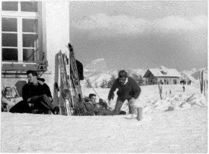 Dolomiti / Sciatori in sosta presso un rifugio sullo sfondo della Marmolada