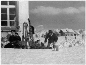 Dolomiti / Sciatori in sosta presso un rifugio sullo sfondo della Marmolada