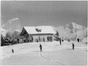 Dolomiti / Sciatori sul Col Rodella sullo sfondo del Gran Vernel e dei Monzoni