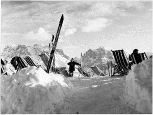 Dolomiti di Brenta / Monte Spinale / Sedie a sdraio sulla terrazza innevata del Rifugio Spinale