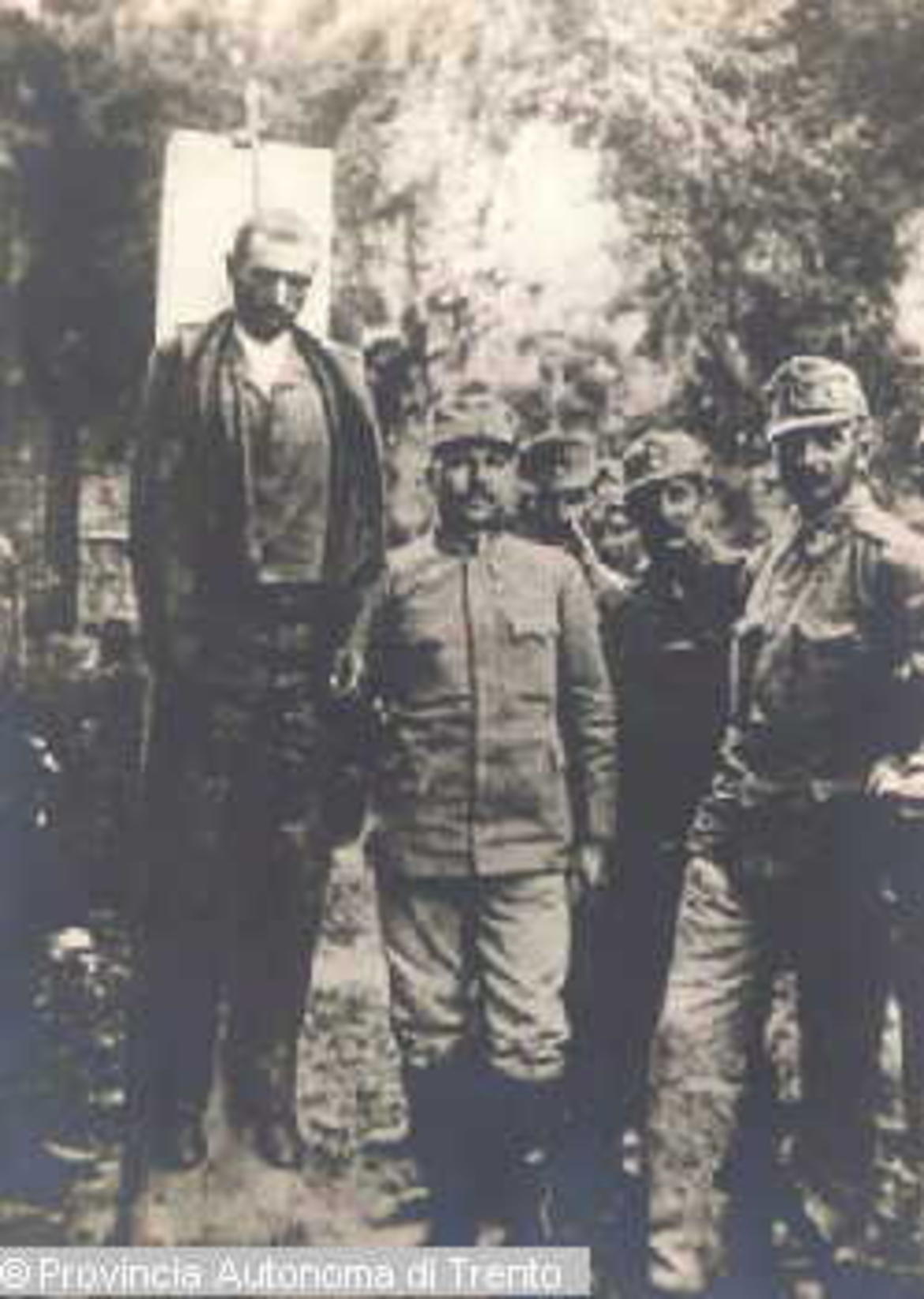 - TRENTO. FOSSA DELLA CERVARA, CASTELLO DEL BUONCONSIGLIO. FABIO FILZI DOPO L'IMPICCAGIONE. 12 LUG. 1916