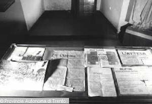 - TRENTO. CASTELLO DEL BUONCONSIGLIO. SALA DEI VOLONTARI TRENTINI. VETRINA DEDICATA A TRENTO REDENTA: DOCUMENTI DIVERSI (VOLANTINI, GIORNALI, FOTO) DEI GIORNI DELL'ARMISTIZIO (LATO SINISTRO)