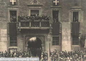 TRENTO. PELLEGRINAGGIO DEI MUTILATI DI GUERRA. CARLO DEL-CROIX PARLA DAL BALCONE DEL MUNICIPIO. MAG. 1925