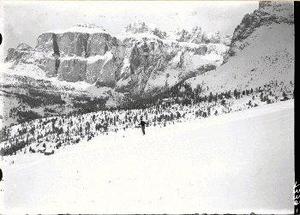 Panoramica su Gruppo Sella e campi neve