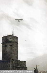 - TRENTO. AEREI SORVOLANO IL CASTELLO DEL BUONCONSIGLIO, IN PRIMO PIANO LA TORRE D'AUGUSTO CON TRICOLORE. 19 GIU. 1921