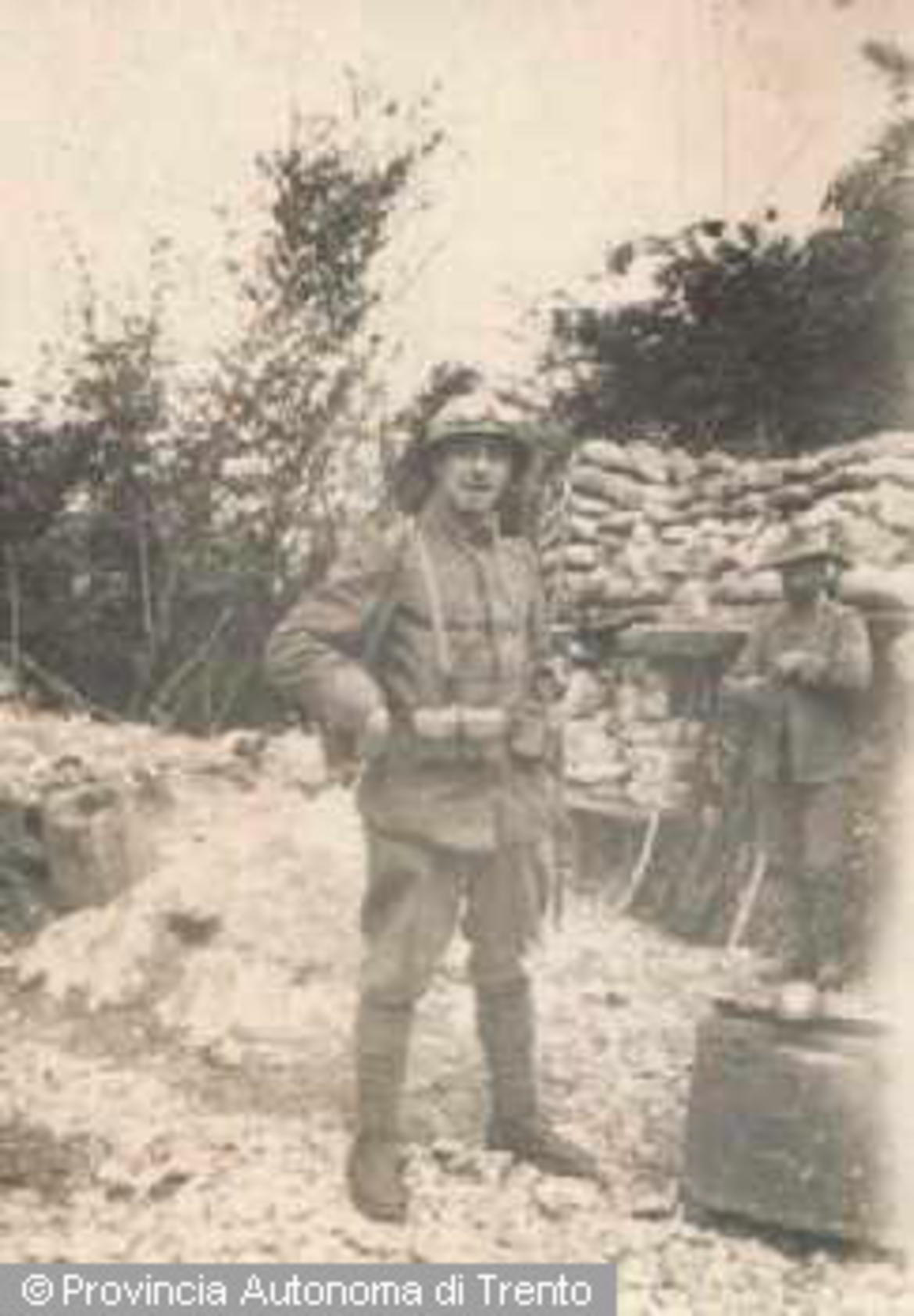 RITRATTO A FIGURA INTERA DI UN UOMO IN DIVISA MILITARE ITALIANA, SULLO SFONDO POSTAZIONE MILITARE