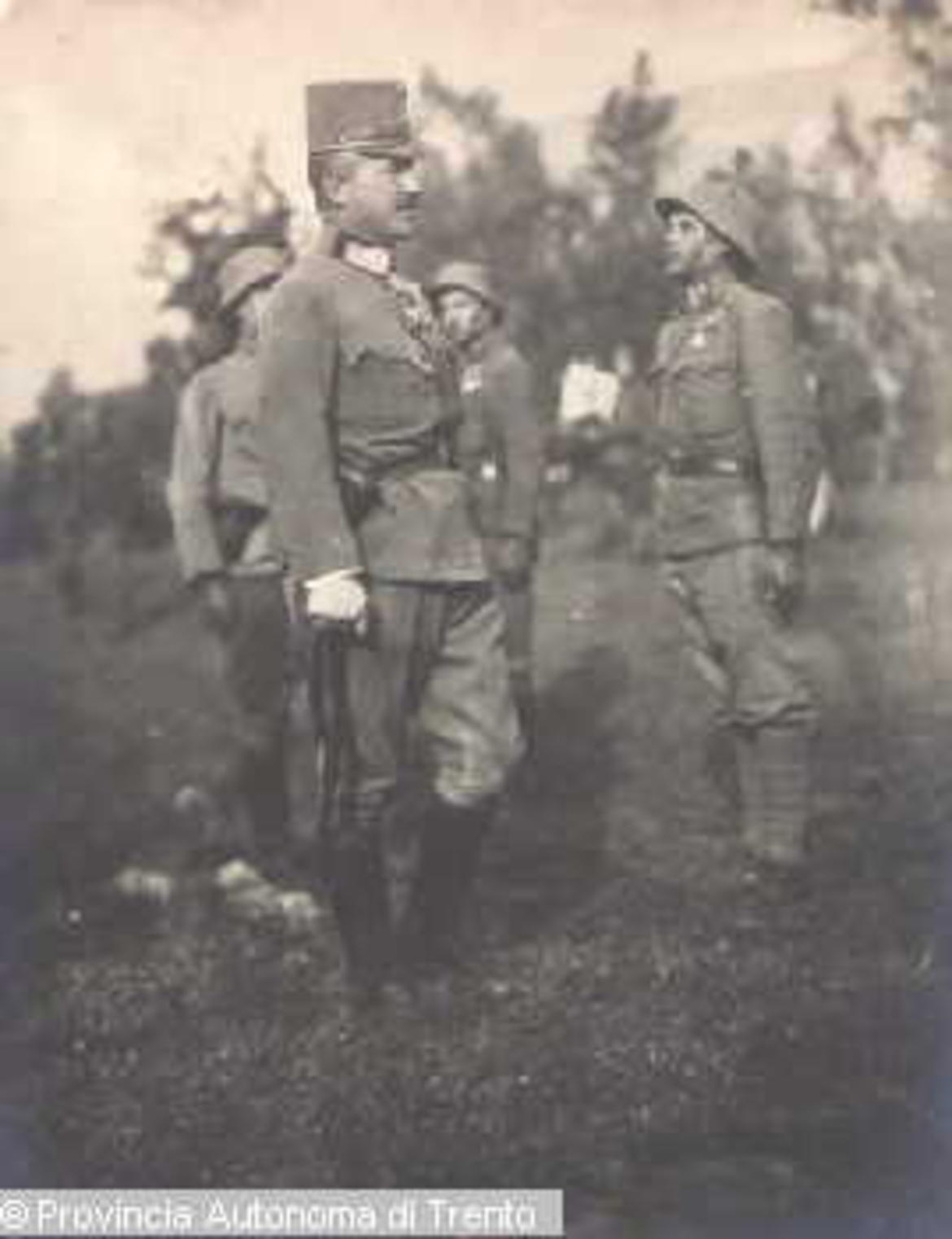 - RITRATTO A FIGURA INTERA DI UN UFFICIALE, SULLO SFONDO UOMINI IN DIVISA MILITARE. 1914-1918