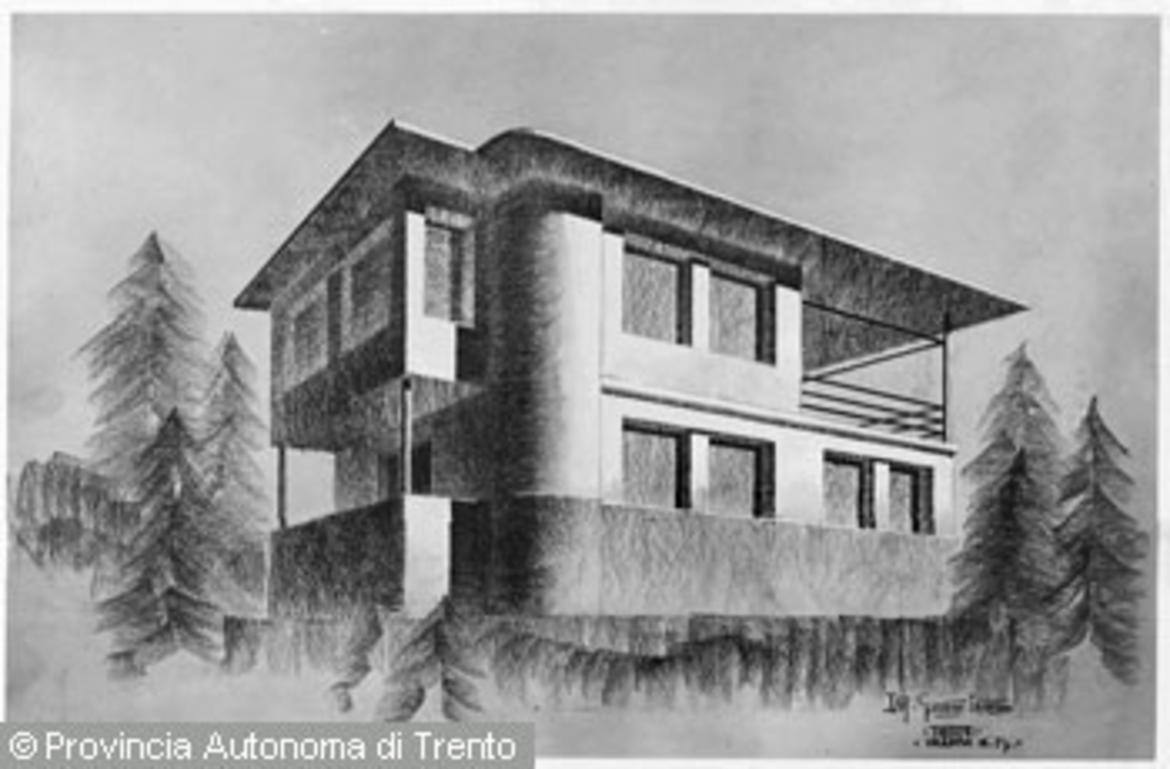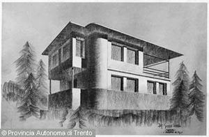 Riproduzione del progetto di una casa di abitazione, bozzetto in prospettiva