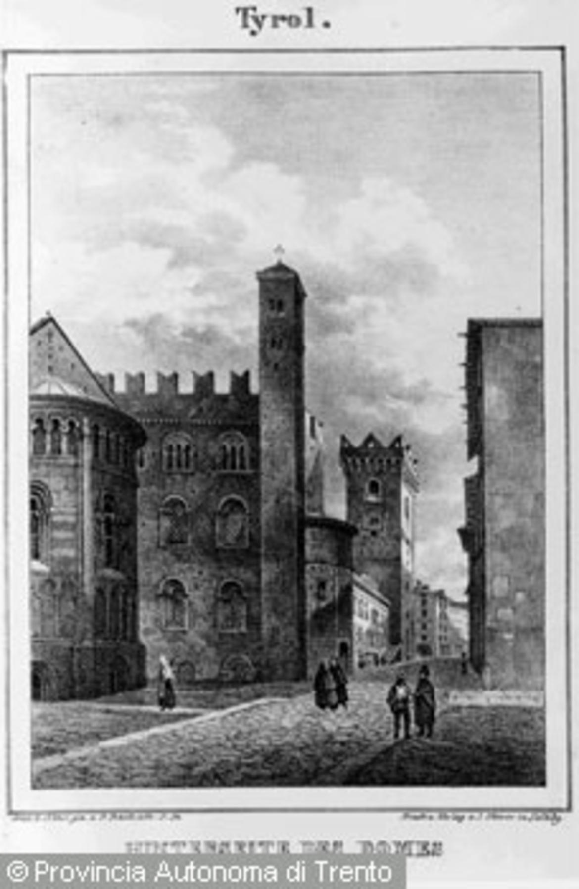- Riproduzione di un disegno raffigurante l'attuale via Garibaldi in Trento con l'abside del Duomo, il Castelletto e la Torre Civica